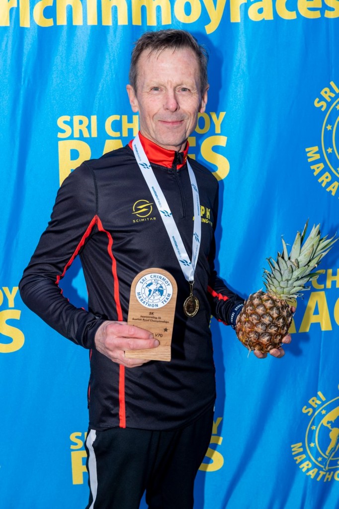 Onto our two medalists now and it was no surprise at all to see Julie Menzies on the podium collecting a V50 silver medal for her run of 19:08, which also bagged her 50 club championship points. Even less surprising was Ed Norton taking home a gold medal in the V70 age band, and of course the traditional winner’s pineapple. What was perhaps surprising was that his time of 19:37 was an overall PB, even more impressive given the conditions were less than ideal.