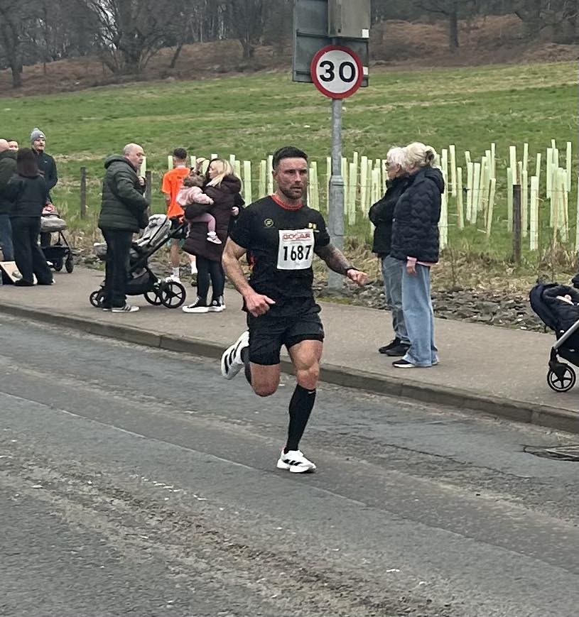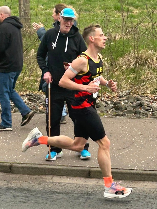 Luke had lead early on in the race, eventually won by Linlithgow AAC’s Sam O’Neill, but fell away slightly in the final 5k. He is already looking to dip under 71 mins in his next half marathon race. Here he is being cheered on by dad Billy, possibly an even faster runner in his day, but currently recovering from a recent operation.